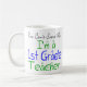Esta design de caneca engraçada apresenta texto verde, azul e preto com a frase engraçada: "Você não pode me assustar! Eu sou professor do 1rua." Esta é uma bela ideia de presente de apreciação de professores para dizer obrigados a um professor.