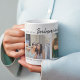 Peça à sua irmã, melhor amiga ou sobrinha para ser sua dama de honra no casamento com esta caneca de colagem de fotos moderna e elegante. Com 3 fotos quadradas de você e a pessoa que você está convidando, com fonte cursiva que pode ser alterada para qualquer cor. Todo o texto é facilmente personalizado usando o modelo fornecido.