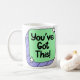 Aumente a sua confiança todas as manhãs com esta animada e encorajadora caneca de café. A design apresenta uma mensagem elevando "Você tem isso!" em uma bolha verde de fala da casa da moeda com uma borda roxa, realçada por estrelas cintilantes. O estilo desenhado à mão adiciona um toque pessoal que faz com que este lembrete motivacional se sinta como uma nota amigável de alguém que acredita em você. Perfeito como um presente pensativo para alguém que enfrenta novos desafios, iniciar um novo emprego, ou qualquer pessoa que precise de uma dose diária de encorajamento com sua bebida favorita.
