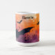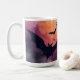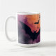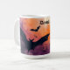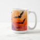 Bates grandes e assustadores voam sobre um fundo de cor solar nesta caneca de Halloween assustada e assombrada.