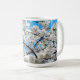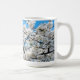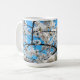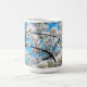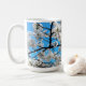 Coffee cup featuring white cherry blossom flowers photographed against a clear, blue sky.