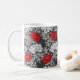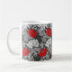 Caneca de café numa vintage William Morris, Art Nouveau, impressão floral de crisântemos estilizados, melhorada digitalmente e colorida, em tons de cinza/cinza de prata e branca, acentuados com vermelho profundo, sobre um fundo de cinza de grafite escura