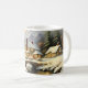 Two houses on a snowy morning, beside a river and sheltered by mountains, make a beautiful winter scene on this holiday mug.