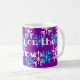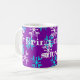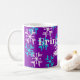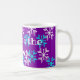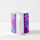 Esta caneca tem uma mensagem de vinho com flocos de neve azuis e brancos sobre fundo roxo. Excelente para café de inverno, chá ou cacau quente.