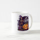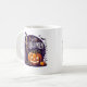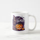 Celebrate the spooky season in style with this vibrant and festive Halloween design. A cheerful skeleton, looking dapper in a classic witch hat, offers a friendly wave from a whimsical graveyard under a starry, moonlit sky. Beside him, a large jack-o'-lantern grins with a warm, inviting glow, perfectly capturing the fun spirit of Halloween. This mug's bold colors and classic characters make it the ideal companion for sipping hot coffee, cider, or cocoa all October long. A fantastic gift for anyone who loves a perfect mix of spooky and fun.