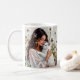A pretty personalized coffee mug with an illustration of a woman holding a white fluffy cat surrounded by dandelions, The picture has a crochet style fabric look.