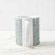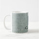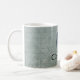 Design de caneca branca para Alice no País das Maravilhas, amantes de todas as idades, apresenta letra maiúscula / C inicial com preenchimento de harlequin preto e azul e ilustração original do Rabbit Branco que foi pintada, em um fundo de cor azul-azul, floral e vírgula angustiado. Personalizar com nome ou outra mensagem
