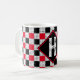 Quando o clássico retrô inspira a arte moderna, esse padrão de quadrados geométricos vermelhos e pretos é inspirado pelo estilo de xadrez de búfalos e de lousa, com um toque, uma geometria de abstrato de memórias em um padrão estético para formar um padrão decorativo na moda e elegante composto por círculos geométricos e quadrados em vermelho e preto para dar uma decoração agradável numa caneca de café. Este design pode ser facilmente personalizado com monograma personalizado Inital para ser o melhor presente de aniversário e feriados únicos presentes para o natal para o novo fã de padrões vermelhos e negros para uma arte decorativa.