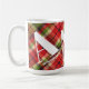 A xadrez de Natal em vermelho, verde, ouro e preto mostra o seu monograma inicial em letras grandes brancas em chic nesta caneca de café única - perfeita para si mesmo ou como presente. *DICA: talvez seja necessário usar as ferramentas Editar para ajustar o posicionamento da sua versão inicial.