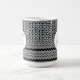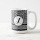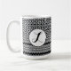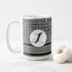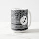 A parte superior da sua caneca é coberta por um padrão retrô repetitivo de medalhão com formas de diamante côncavo dentro, e a parte inferior tem filas de ziguezags de diferentes espessuras. Sobre as áreas centrais onde os padrões se encontram está um medalhão branco com uma borda pontilhada a preto e branco. Por cima é um espaço para o seu monograma. Mude a carta para o que quiser. Você também pode mudar a fonte do monograma se quiser.