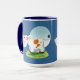 Esta linda vaca branca olha para vocês em ambos os lados da caneca com olhos abertos de surpresa. Ela está de pé num fosso de grama e uma lua azul está atrás dela ao longo do horizonte, apoiada por um fundo azul profundo. Seu nariz é rosa e ela tem algumas manchas marrons no corpo. Esta caneca tem acentos azuis para corresponder à cor do plano de fundo. Você pode mudar o azul para rosa ou verde para pegar qualquer uma das cores encontradas no design gráfico.