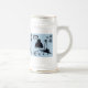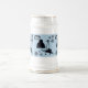 Hat, skis, goggles, & snowflakes on a light blue background beer stein . Refresh after a fun day on the slopes.