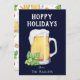 Caneca de cerveja pintada e cacho de lúpulo em azul festivo com padrão correspondente no verso, cartão engraçado "Férias Alegre".