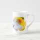O design original das belas artes de um peixe colorido da borboleta do Threadfin ou do Auriga pelo artista Carolyn McFann do estúdio de ronrom de dois gatos imprimiu em uma caneca da porcelana de osso da qualidade para fãs tropicais dos peixes do recife de corais.