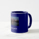 Uma caneca com uma imagem de Cleveland do centro, com um fundo azul da meia-noite e uma beira do ouro.