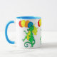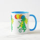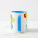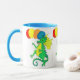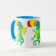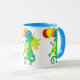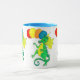 Uma caneca colorida com dragões verdes e amarelos, balões de carregando, de uma pintura aquosa de Judy Adamson.
