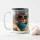 Uma linda caneca de café com uma vibração divertida e humorística. A caneca apresenta uma imagem caricatural de um gato que parece relaxado e legal, vestindo óculos escuros. O gato parece descuidado, como se estivesse simplesmente desfrutando do sol. A combinação do gato com os óculos de sol dá à caneca um sentimento moderno e moderno, perfeito para amantes de gatos que querem se divertir um pouco com seus momentos diários de café. As cores da caneca são brilhantes e alegres, fazer-a uma adição divertida e atraente ao seu cozinheiro.