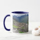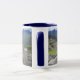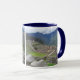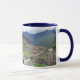copo branco com o picchu do machu nele com borda e o punho azuis