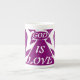 Apanhar Deus é Amar Profundo Bone China Mug - Luxo Passe seu café com verdadeiro luxo! Este requintado Bone China Mug mostra o elegante Mystical Deep Purple e a design de Cinza "Deus é Estrela do Amor". O material fino de porcelana é leve e refinado, fazer que esta caneca seja uma peça de teia de fé de qualidade superior, baseada em herança. O roxo rico é uma adição sofisticada a qualquer escritório ou cozinha. Esta peça é inspirada pela graça de 1 John 4:16. Encontre este e outros presentes premium do Achempong Zazzle e verifique os códigos promocionais para obter descontos!