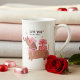 Amo-te Um Cachorro Francês Bone China Mug, Cute-Nunca Cute, apresenta um cão Dachshund bonito vestindo óculos em forma de coração, boina rosa e arco segurando uma flor e presentes de carregando com o texto "Ame-te pelo-nunca" na tipografia moderna da escrita. Acentuado com corações amorosos vermelhos fofos. Presente perfeito para namorada, querida, esposa, amante de cachorro e muito mais para Dia de os namorados, Natal, aniversário, feriados, aniversário e muito mais. Criado pelo Evco Studio www.zazzle.com/store/evcostudio