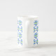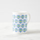 Uma caneca chinesa de na moda Bone com um padrão Art Nouveau em azul brilhante, verde e branco, de um design pintado à mão por Judy Adamson.