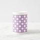 Bone China Mug desenhada com um padrão de bolinhas variado com tamanhos alternados de círculos brancos sobre uma roxa ao estilo de café, e esboçada no topo e no fundo da cinza.