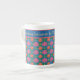 Uma caneca de café chinesa com osso, com um padrão floral de flores cor-de-rosa e laranja, agrupada com um padrão de Bolinhas correspondente num fundo azul profundo. Parte da coleção Posh & Painterly 'Rangoli', este padrão pode ser ajustado para ajustado qualquer Mug.