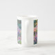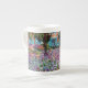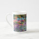 Uma caneca clássica colorida de China de osso que caracteriza íris em um jardim, pintado pelo pintor impressionista francês Claude Monet.