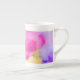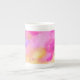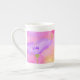 Uma caneca de porcelana bonita e feminina com um design floral em água-tinta em rosa brilhante.