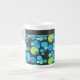 Uma Mug de Café China Bone muito na moda, com um padrão abstrato de 'Luas Azuis' em azul brilhante e verde neon em fundo preto; de um design de colagem de papel pintado à mão por Judy Adamson. Você pode adicionar texto à banda simples no topo ou simplesmente deixá-la simples.