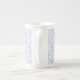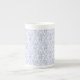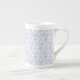 Uma Caneca China Óssea, com um padrão de contornos de flores de Bright Blue Periwinkle, dentro de uma forma de diamante sobre fundo branco. Parte da coleção Posh e Painterly 'Periwinkle Patch', este padrão pode ser facilmente ajustado para ajustado qualquer Mug.