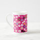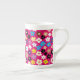 Caneca de café em porcelana de osso com padrão floral multicolorido fofo e colorido, apresentando pequenas flores roxas, brancas, rosadas e amarelas em um fundo rosa fúcsia.