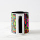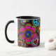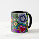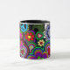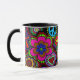 Uma caneca com um design vívido e colorido de sinais de paz, de paisley, de ankhs, de corações, e de flores. Um flash far-out de volta aos anos 60.