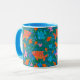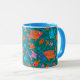 Uma divertida Caneca de Ringer de Cerâmica Branca, com uma Borda e Cabo Azul Brilhante e um padrão de peixes coloridos nadando no oceano, de uma colagem de papel pintada à mão caprichosa por Judy Adamson. Parte da coleção 'Peixes no Mar' da Posh and Painterly, este padrão pode ser ajustado para se adequar a qualquer Caneca.