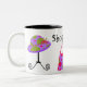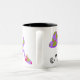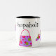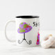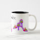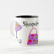 Uma caneca branca, com gráficos divertidos de um chapéu cor-de-rosa, lavanda e verde, bolsa e saltos altos. O texto preto no topo diz Shopaholic. Excelente para uso diário em casa ou no escritório.