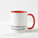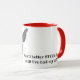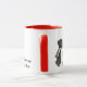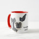 Caneca de café com vaca aquosa e trocadilho de vaca giro em preto, branco e vermelho.