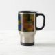 Uma Caneca de viagem legal, com um padrão de verificação abstrato em tons de azul escuro, verde escuro e cor de terra quente.