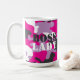 Mágicas e copos personalizados com "Senhora Chefe" em tipografia de stencil com camuflagem rosa em ambos os lados.