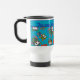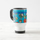 Uma legal Caneca de viagem para personalizar, com um padrão de corujas bonitinhas em vermelho, azul, verde em um fundo azul-turquesa. O padrão da coruja é de um design de colagem de papel pintado à mão original por Judy Adamson.