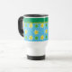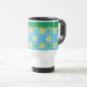 Uma Caneca de viagem Não-Derramar bonito para personalizar, com um padrão de Primroses e Bolinhas Verdes num fundo Azul Céu, agrupada com Bolinhas Amarelo e Branco; parte da coleção 'Primroses' Posh & Painterly.