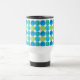 Um Viagem de chic ou uma caneca de Viagem ao trabalho, com um padrão de grade de luas azuis em Neon Green, Emerald, Turquoise e Dazzling Blue sobre um fundo branco que você pode facilmente mudar se desejar - Black ou Royal Blue também parece bom. Parte da coleção 'Luas Azuis' de Posh & Painterly.