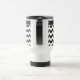 Uma Caneca de viagem branca na moda para você personalizar, com um padrão ziguezague de cavaleiros negros e brancos em tendências. Se você preferir a caneca de viagem sem nenhum texto, poderá personalizá-la facilmente, excluindo o texto e movendo o padrão de gavão para cima até que a banda de texto simples desapareça.