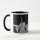 Descoberta de Shuttle Espacial intersetando a fina linha da atmosfera terrestre, enquanto ancorada com a Estação Espacial Internacional em destaque com o STS-131.