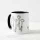 Canecas de café com um desenho feito à mão, estilo tradicional de caneta e tinta de uma série de velhas chaves mestre antigas. A arte das chaves mestre é impressa em ambos os lados da caneca. Arte: Caneta e tinta sobre papel. Direitos autorais Dominic A. White.