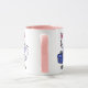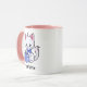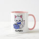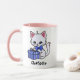 Ilustração de gatinho bonito em uma caneca branca com manípulo rosa e interior. Gato branco com orelhas cor-de-rosa e uma gravata arco azul segurando uma embalagem azul com um arco. O nome na parte inferior pode ser alterado ou removido. Esta caneca aguda está disponível em muitos tamanhos e estilos e a cor das alças/dentro pode ser alterada ou tornada branca.