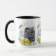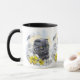 Design memorável com a mão desenhando um gato britânico preto giro e engraçado com flores.