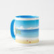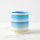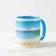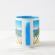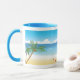 Branco e azul claro 11 oz. uma caneca combinada com uma imagem de desenho de um dia perfeito em uma ilha desértica, com palmeira, cocos e o mar azul profundo. Ver pote de doces correspondente, xícara de café expresso, arremessador, placa de papel, vidro fotografado, bule de chá e portas copos. Veja toda a coleção de Potes de doces de naufrágio na COMIDA/BEV | Seção pratos.