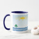 Flutuar ao longo de um rio preguiçoso com o sol amarelo brilhante brilhando de um adorável céu azul e árvores verdes ao longo das margens. Esta caneca apresenta um design simples e abstrato que vai fazer você sonhar.