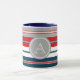Design de temas náuticos com decoração em forma de monograma, em forma redonda, sobre fundo azul, branco, vermelho e cinza listrado