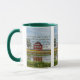 Esta caneca de dois tons apresenta um design que tem uma fonte impressão de Comic Sans com letras azuis claras contornos verdes escuros exibindo o verso da bíblia KJV "Deuteronomy 28:15" sobre uma imagem mostrando uma vista ao lado do lago de um celeiro vermelho nas distâncias sob um céu azul nublado no fundo deste tema baseado na fé. Este verso está referindo o Livro da Deuteronomia 28º capítulo mostrando o verso 15 deste tema de citação de escrituras bíblias do Rei James bíblia. A jante e o manípulo são vidrados em cores compatíveis, disponíveis em micro-ondas e máquinas de lavar louça de tamanho 11 onças ou 15 onças, construindo cerâmica segura.